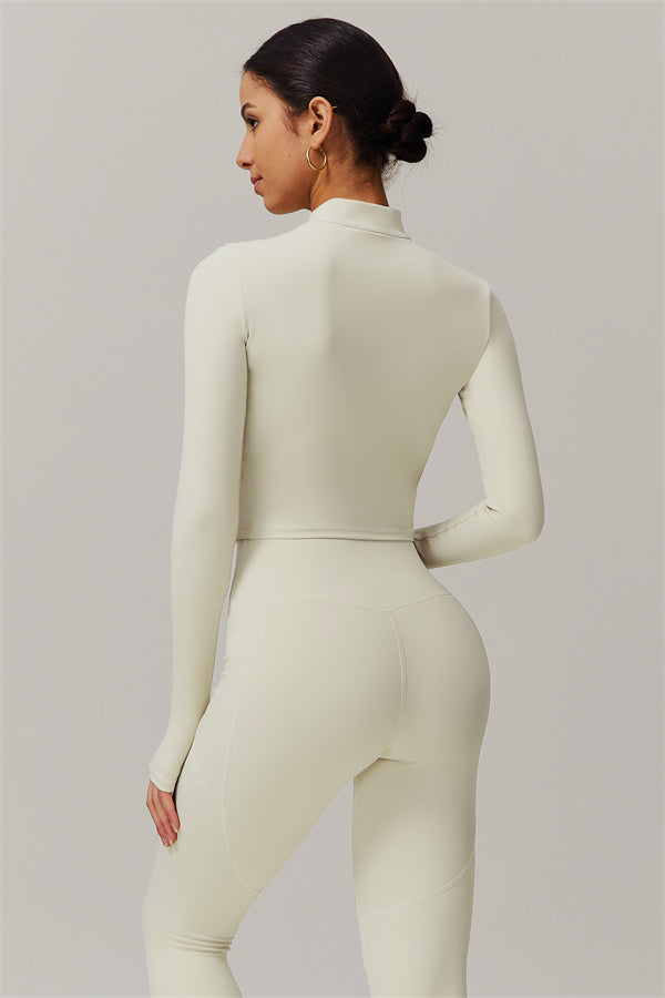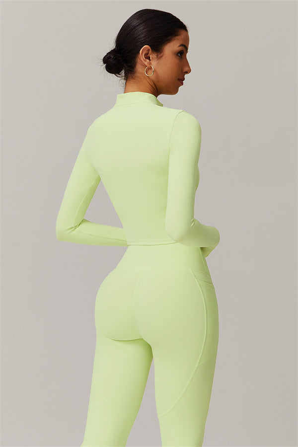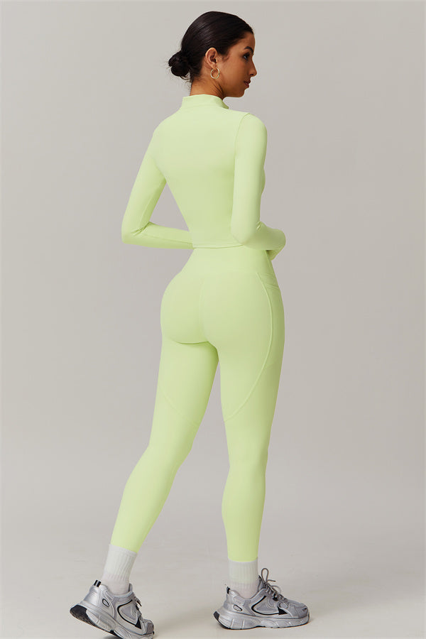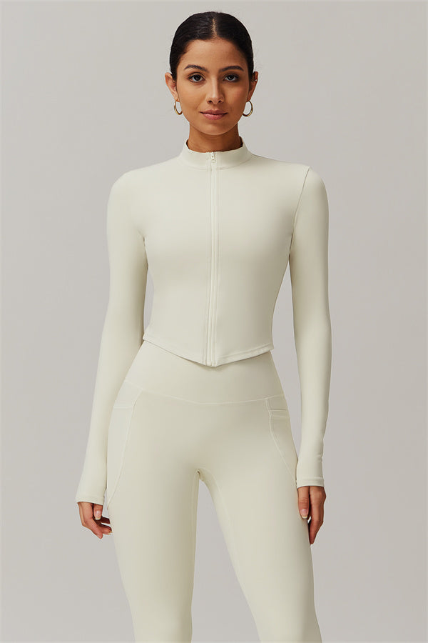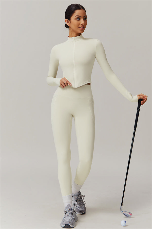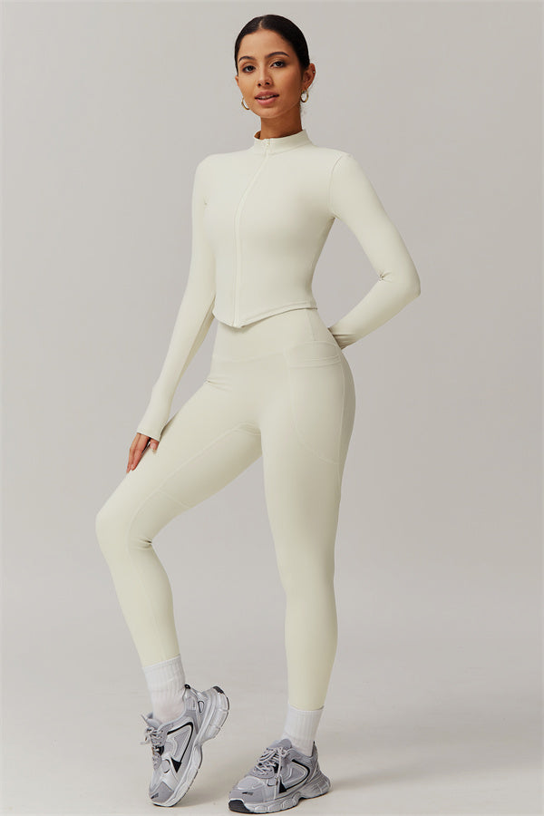 Elevate your activewear game with this sophisticated matching set, featuring a sleek jacket and figure-hugging leggings. The jacket is designed with a stand collar and full-zip closure for adjustable coverage and wind protection, adding a sporty edge to your look. Long cuffs provide slip-resistant comfort, while the V-shaped hemline contours to your body, enhancing your silhouette. Functional side pockets offer convenient storage for your essentials.