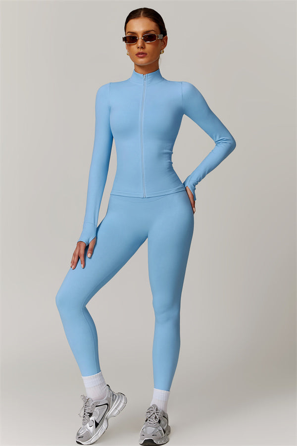 Elevate your activewear collection with this sleek matching set, featuring a high-neck zip-up jacket and sculpting high-waisted leggings. The jacket's full-zip design with a high collar offers adjustable coverage and wind resistance, bringing a stylish, athletic edge to your look. Ribbed, cinched waist detailing enhances your natural shape for a slimming effect, while thumbhole cuffs keep sleeves in place and provide extra protection for your hands during any activity.