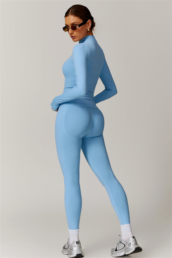The high-waisted leggings complement the jacket perfectly, with a structured waistband that shapes and smooths your midsection. A lifting seam detail at the back adds flattering definition, accentuating your curves and providing a secure, supportive fit. The triangle gusset allows for unrestricted movement, making this set ideal for high-impact workouts and beyond.