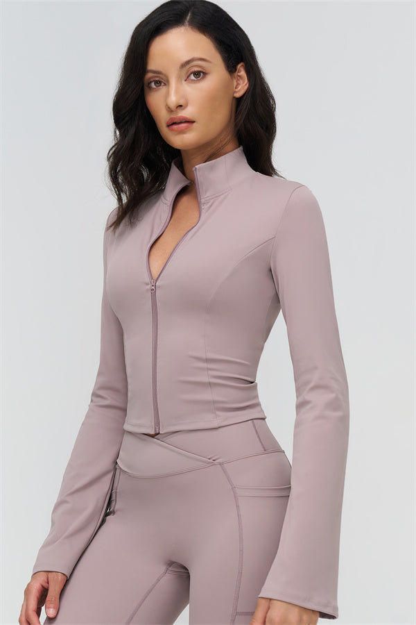 Elevate your workout and casual style with The BoldFit Jacket Leggings Set, designed for a flattering silhouette and functional performance. The fitted jacket features a full-zip high collar, long flared cuffs for an elegant flow, and a waist-sculpting design that hugs your curves. The matching leggings offer a cross-waist waistband to prevent rolling, side pockets for easy storage, and sculpting seams that lift and enhance your glutes.