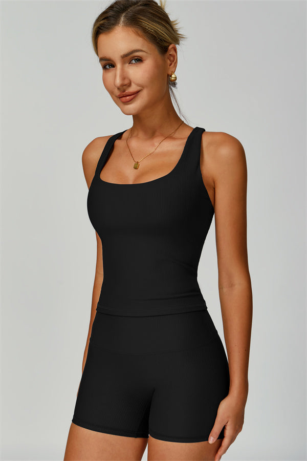 Effortlessly stylish and supportive, The Burst Set is designed to highlight your curves and keep you comfortable all day. This matching set features a square-neck tank with a V-shaped open back and high-waisted shorts with a sculpting ribbed waistband.
