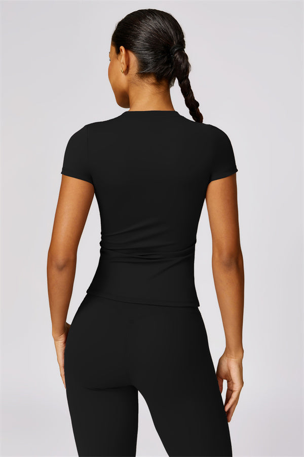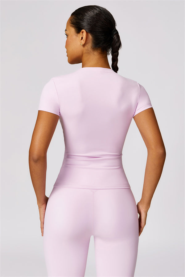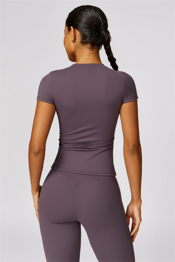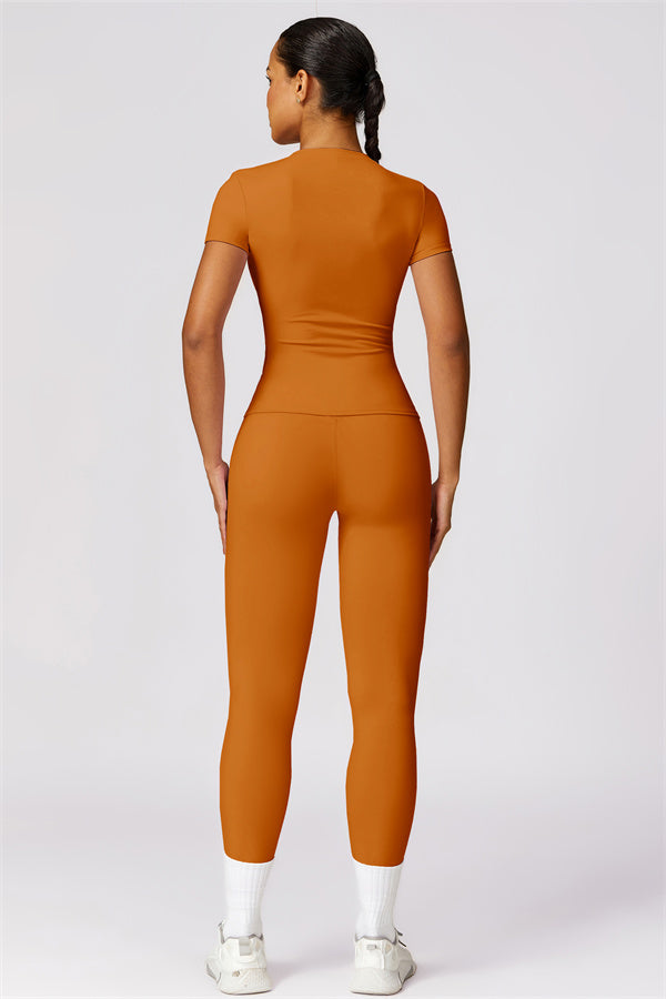 Discover the perfect blend of style and performance with this matching set, featuring a T-shirt and leggings that are ideal for any workout or casual day out. The T-shirt showcases a classic crew neck design that beautifully frames and enhances your neckline, while the leggings offer a flattering and sculpting fit, designed to accentuate your curves and create a round, lifted look.