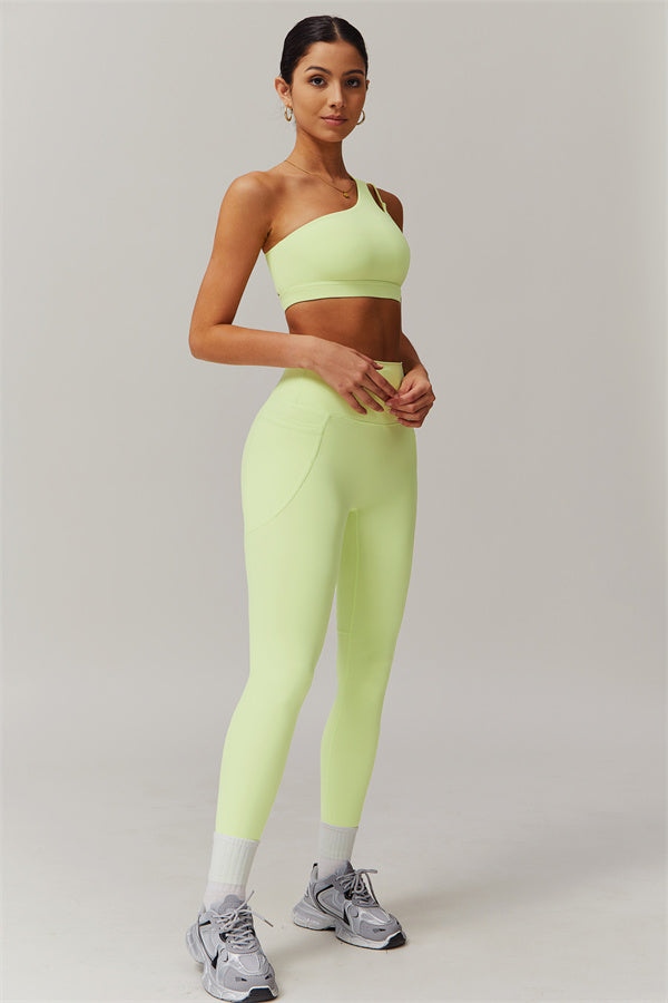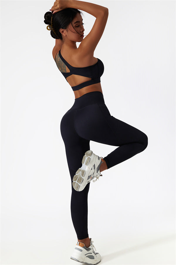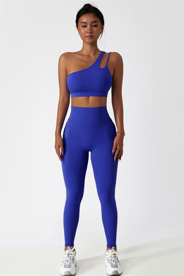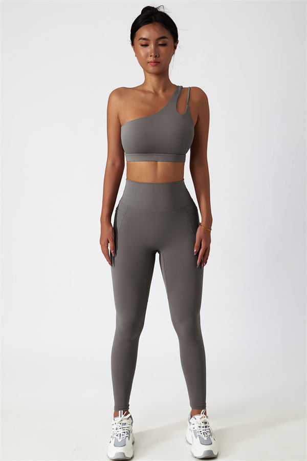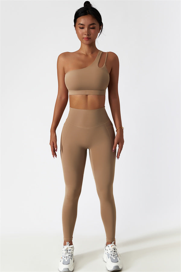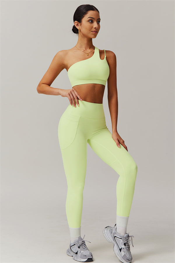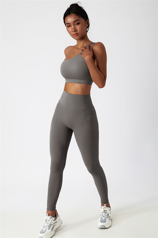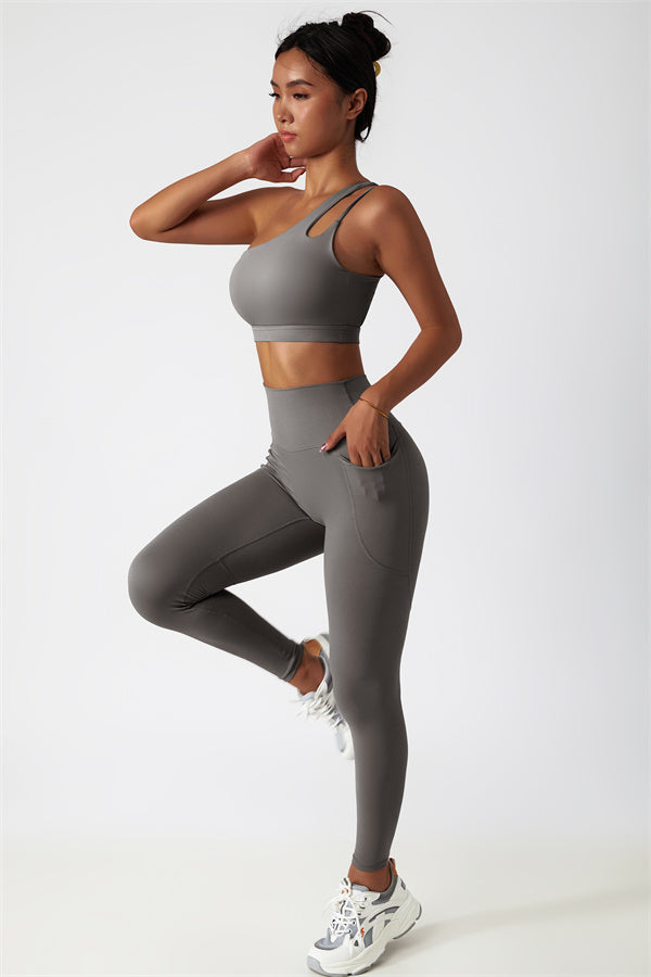 This matching set features a chic sports bra and leggings designed to elevate your activewear collection. The sports bra boasts an asymmetrical, diagonal single-shoulder design for a modern, stylish look. The leggings are crafted with a flattering side pocket detail, adding both practicality and enhancing your curves for a peachy shape.