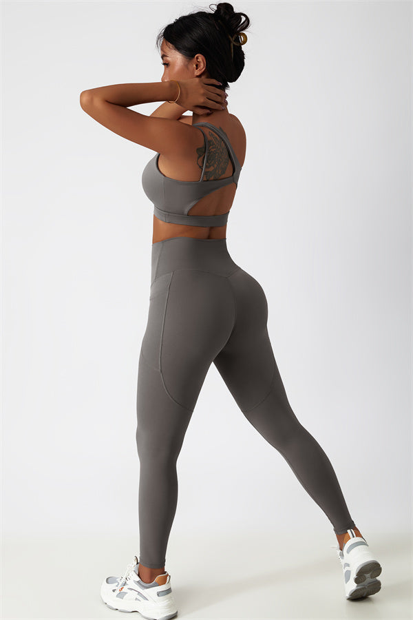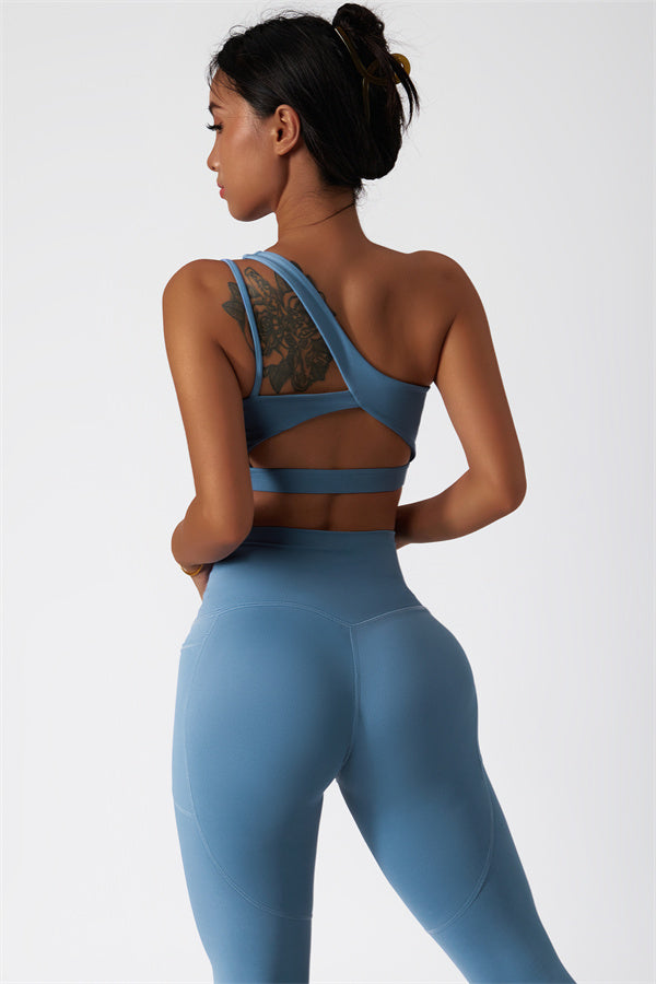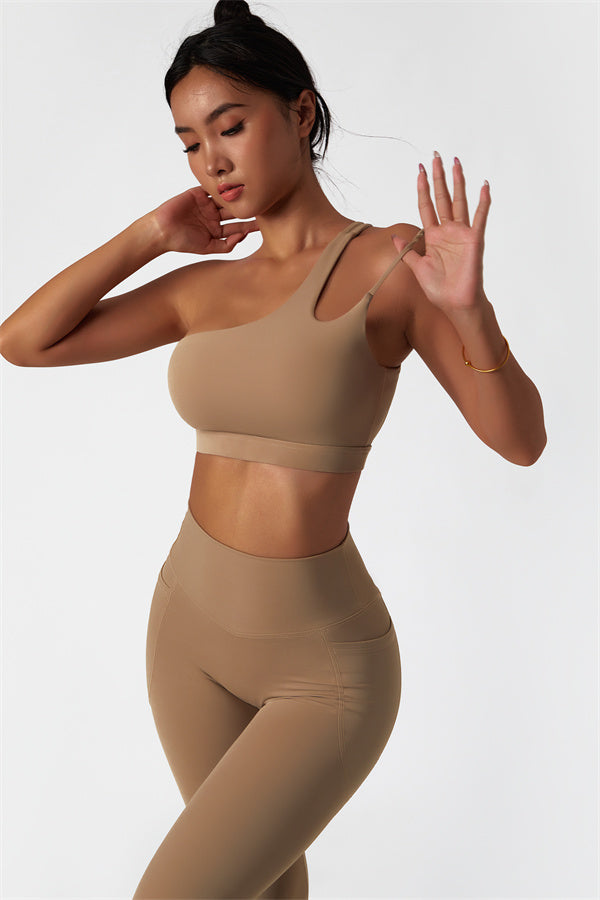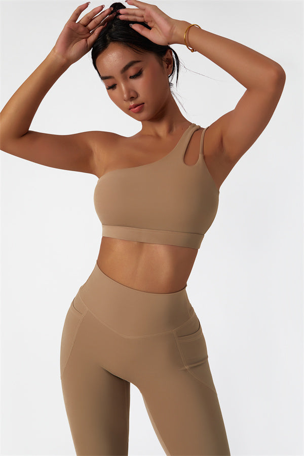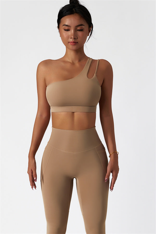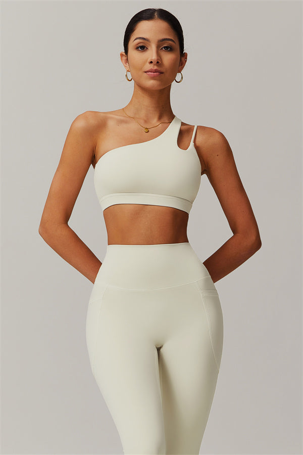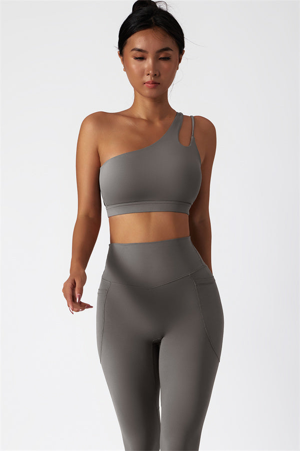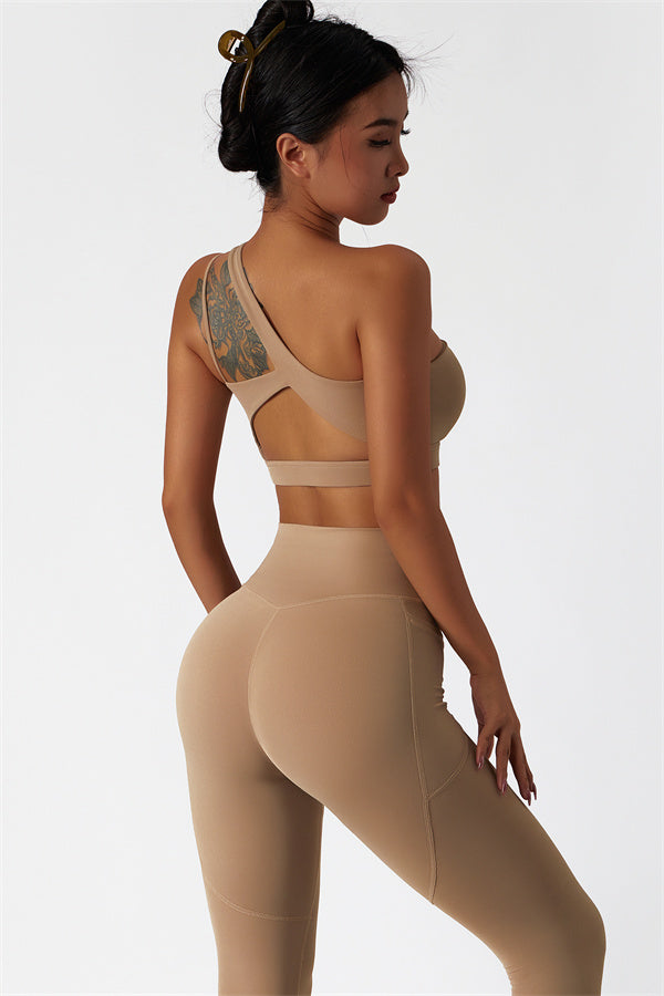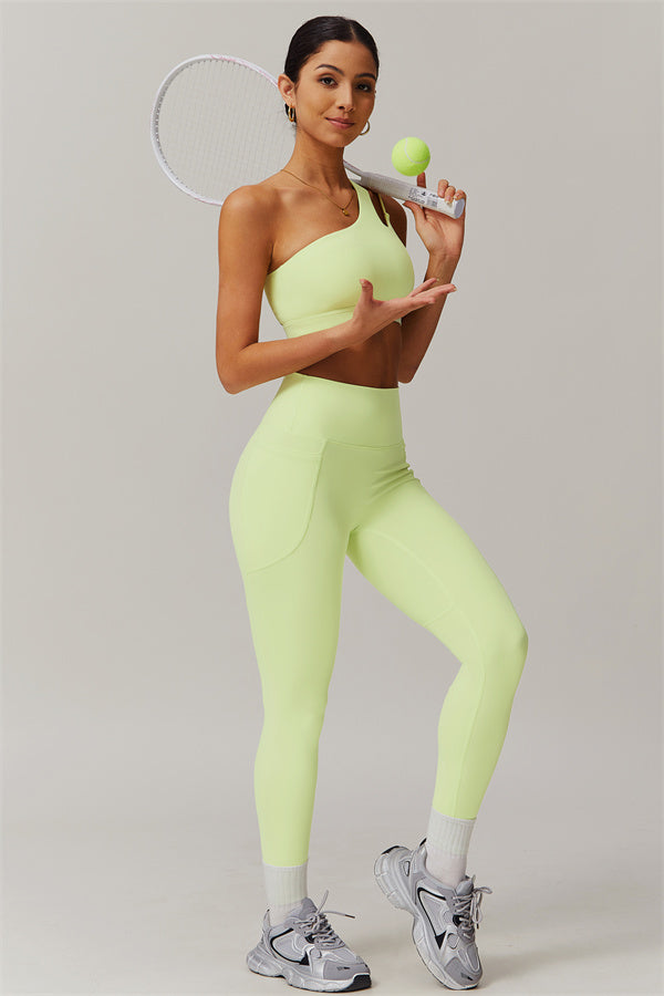 This matching set features a chic sports bra and leggings designed to elevate your activewear collection. The sports bra boasts an asymmetrical, diagonal single-shoulder design for a modern, stylish look. The leggings are crafted with a flattering side pocket detail, adding both practicality and enhancing your curves for a peachy shape.