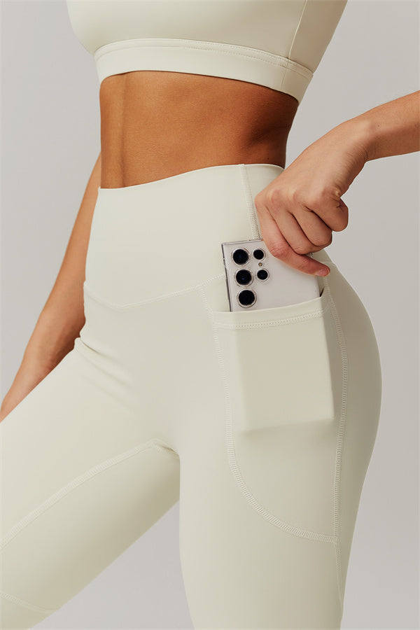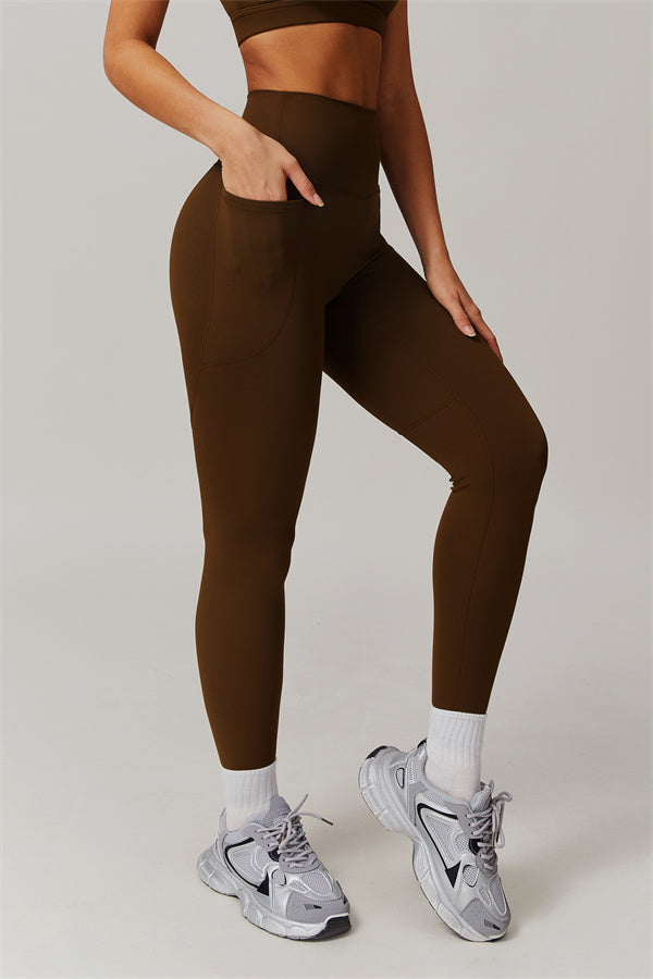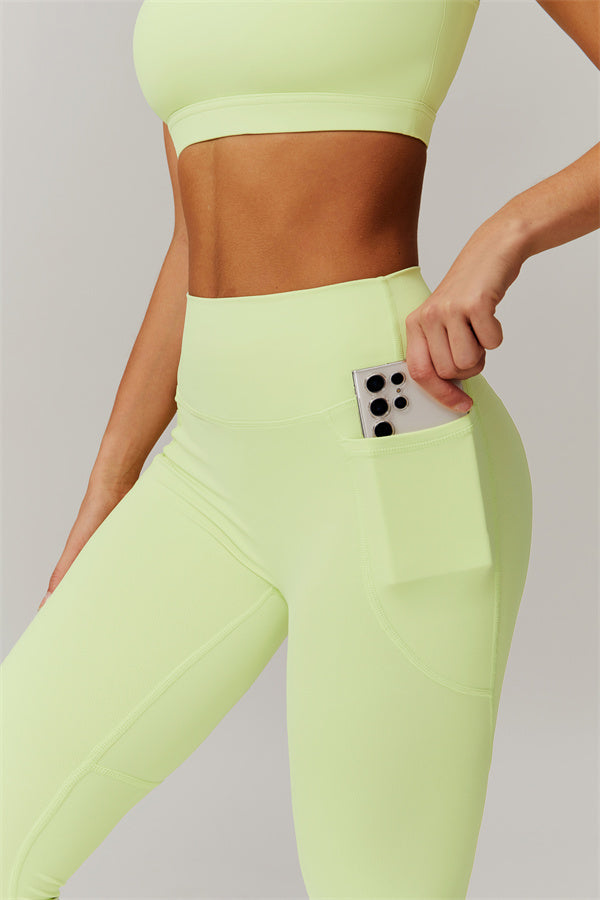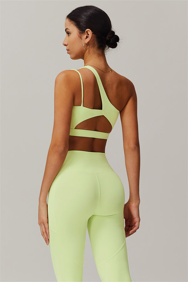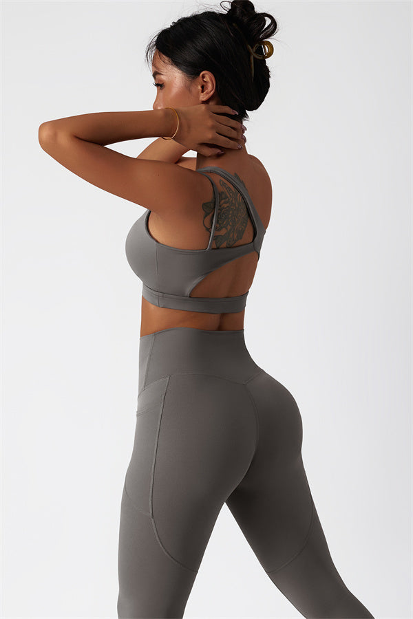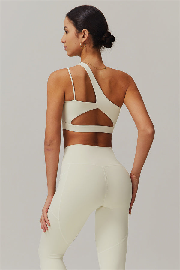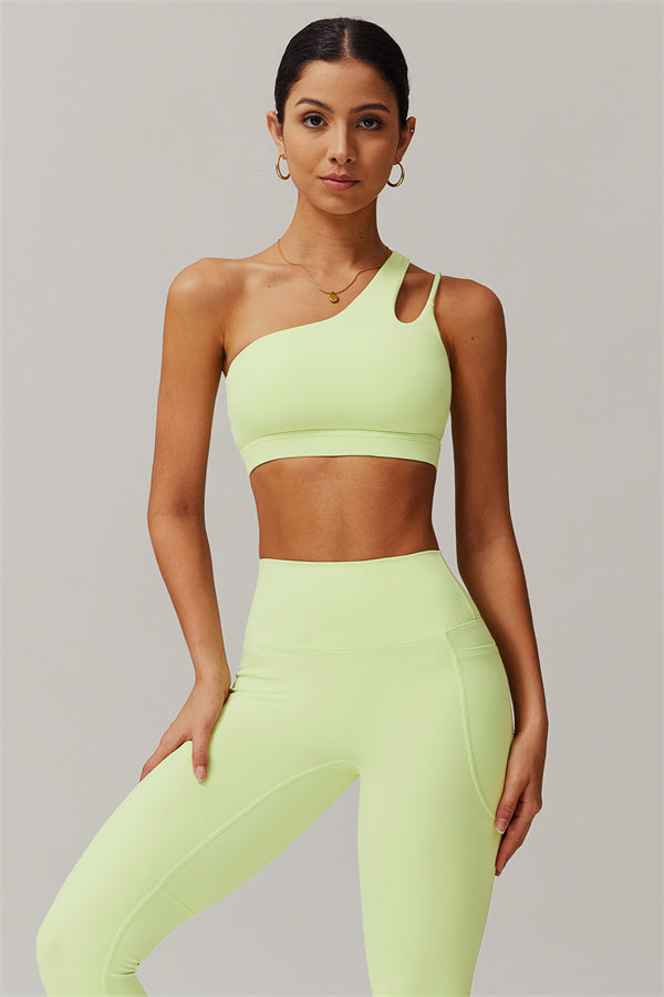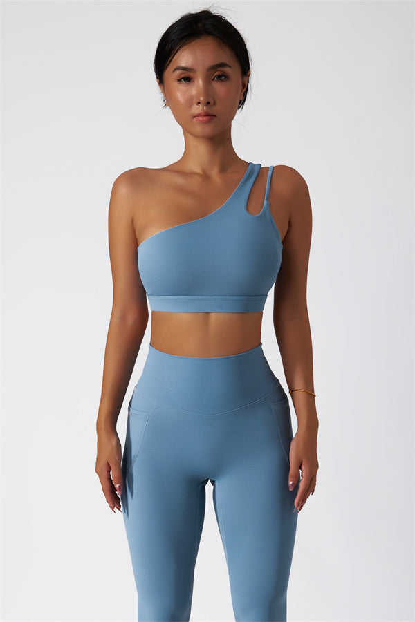 This matching set features a chic sports bra and leggings designed to elevate your activewear collection. The sports bra boasts an asymmetrical, diagonal single-shoulder design for a modern, stylish look. The leggings are crafted with a flattering side pocket detail, adding both practicality and enhancing your curves for a peachy shape.