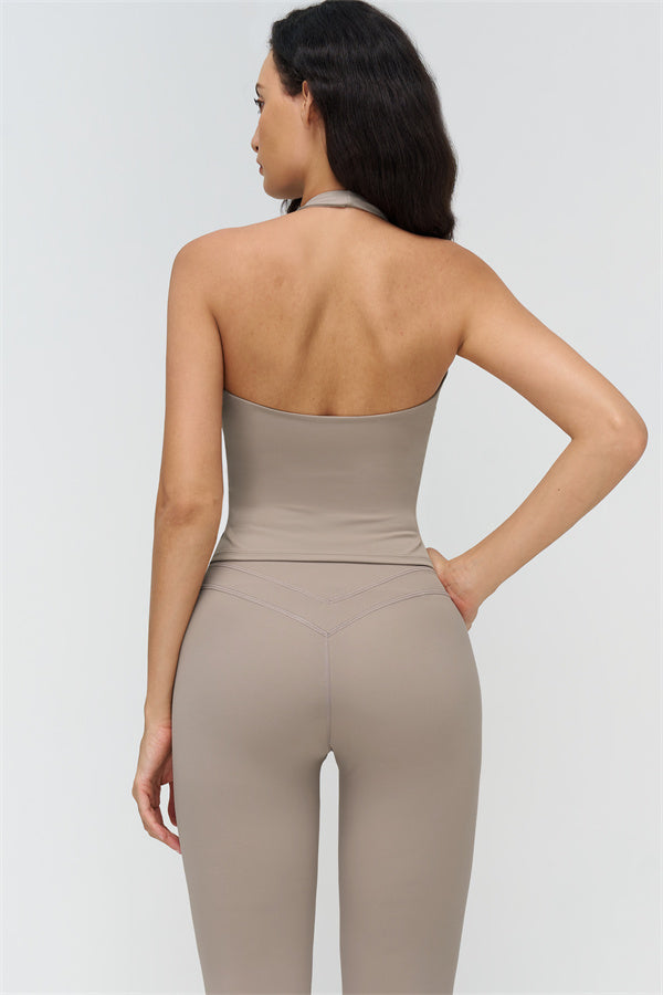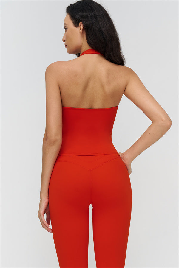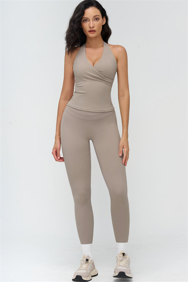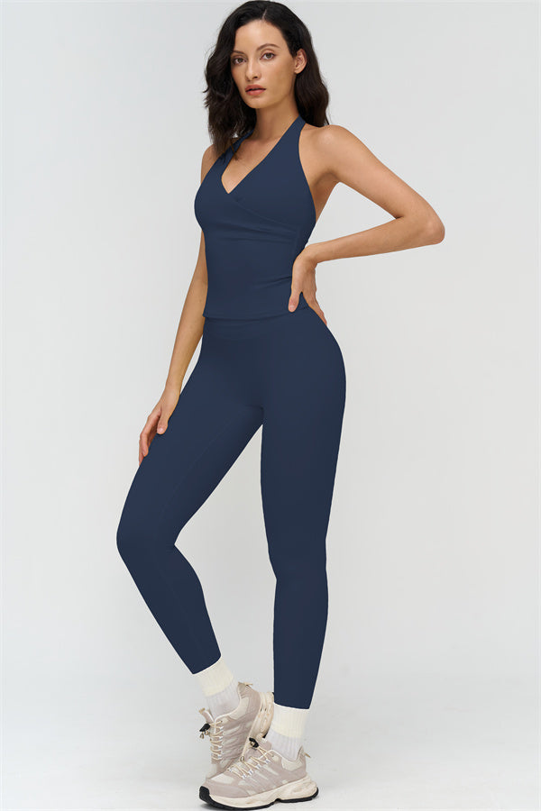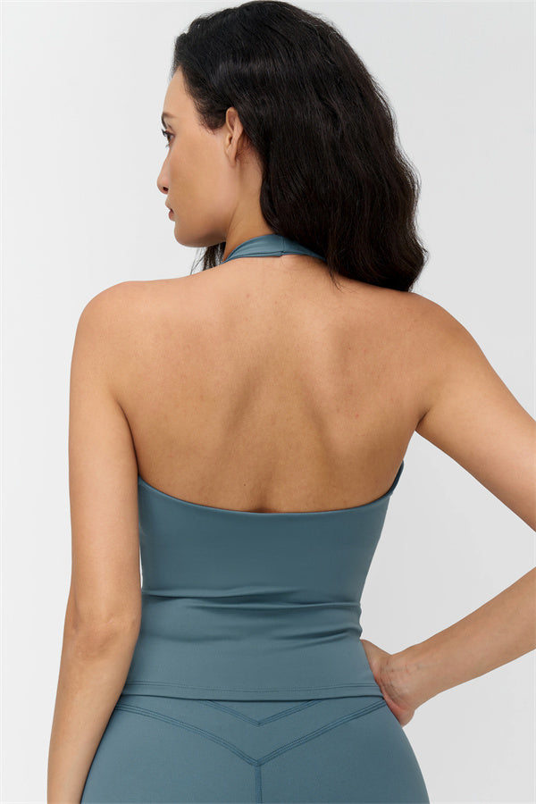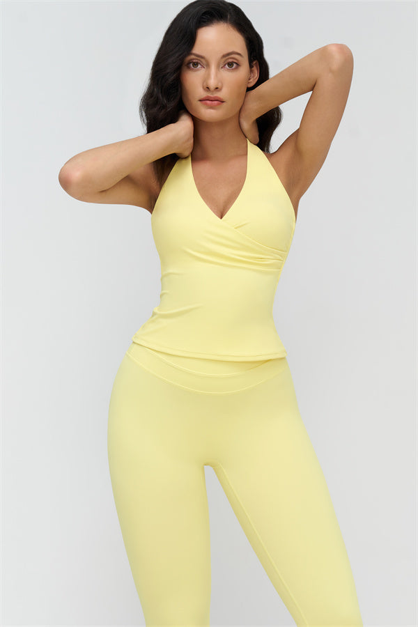 Overlapped V-neck halter design that flatters the shoulders and elongates the neckline