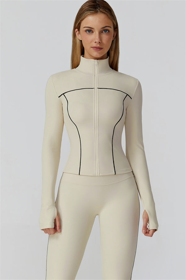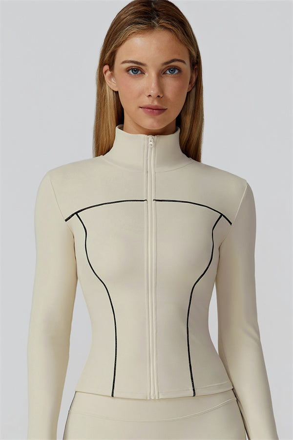 Full-length front zip with stand collar for wind protection