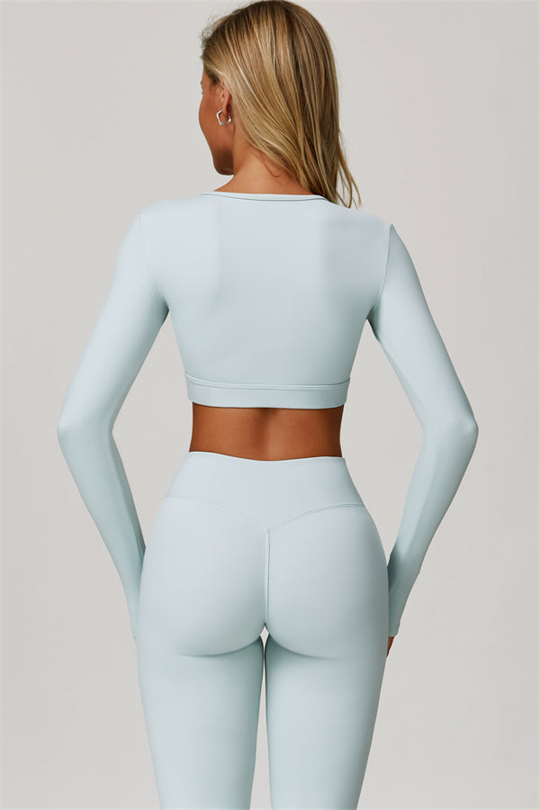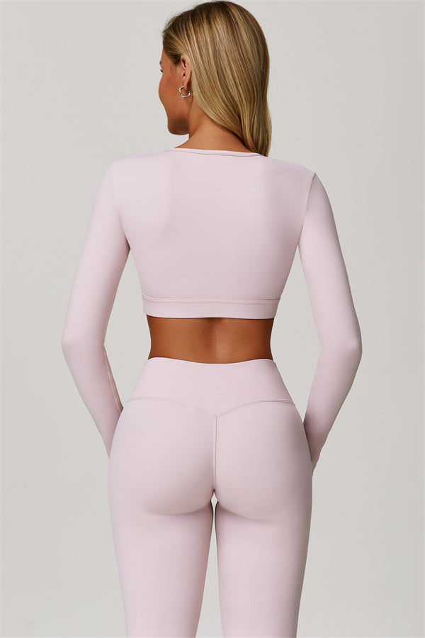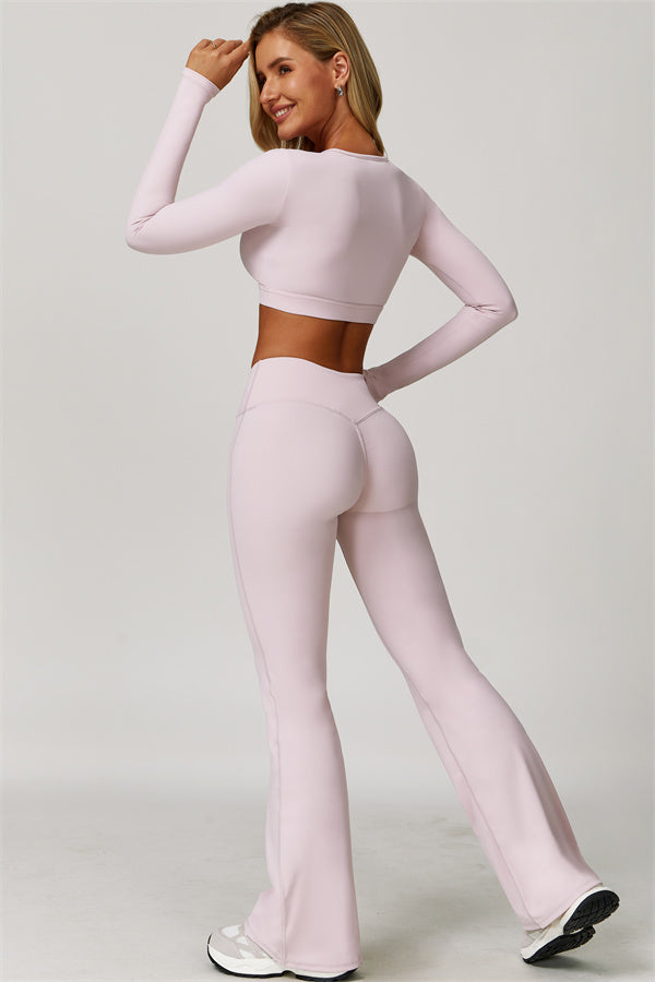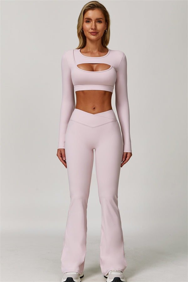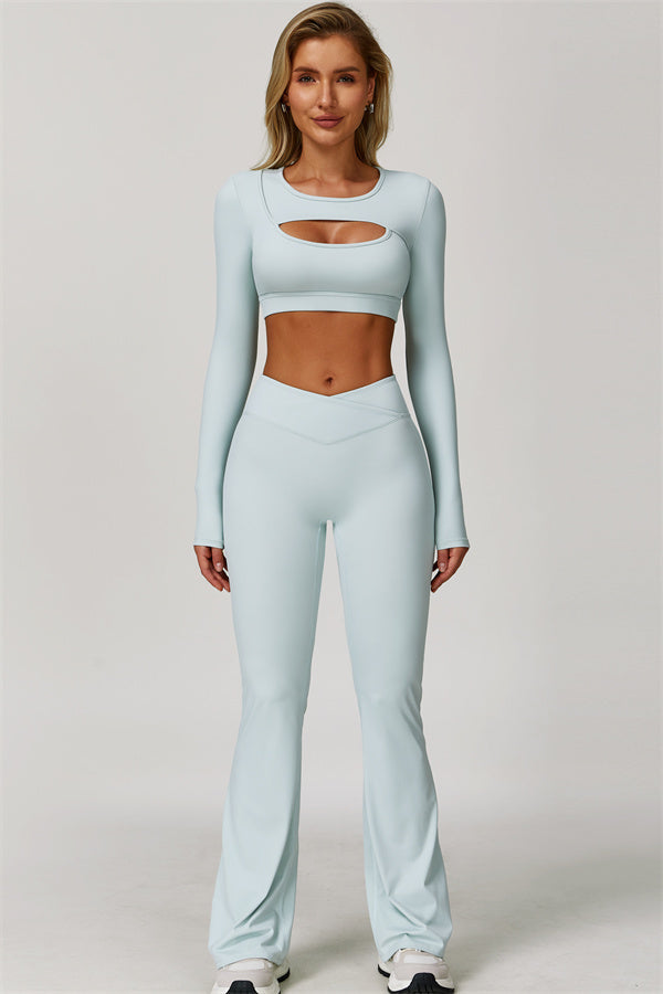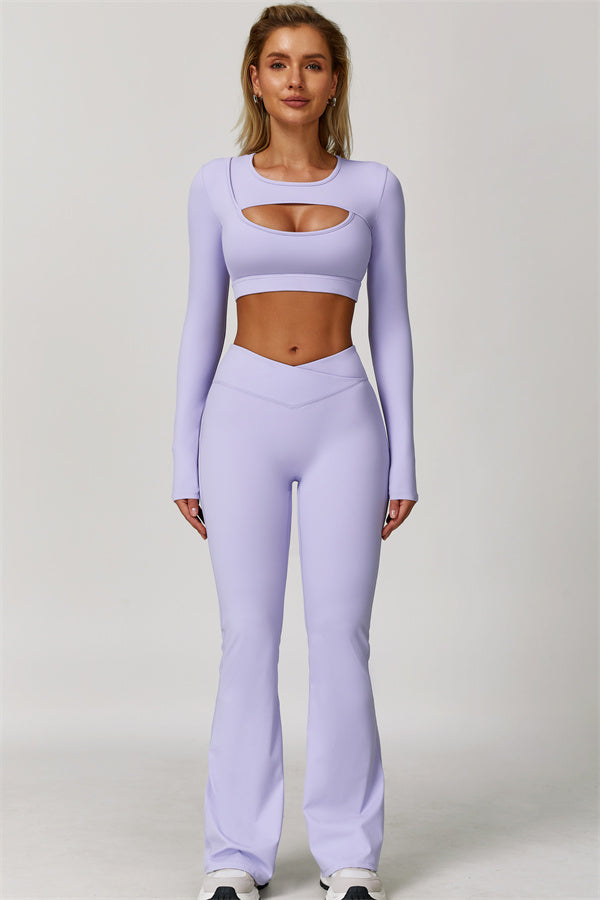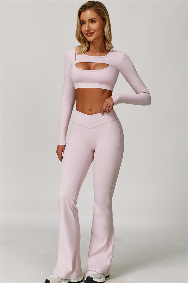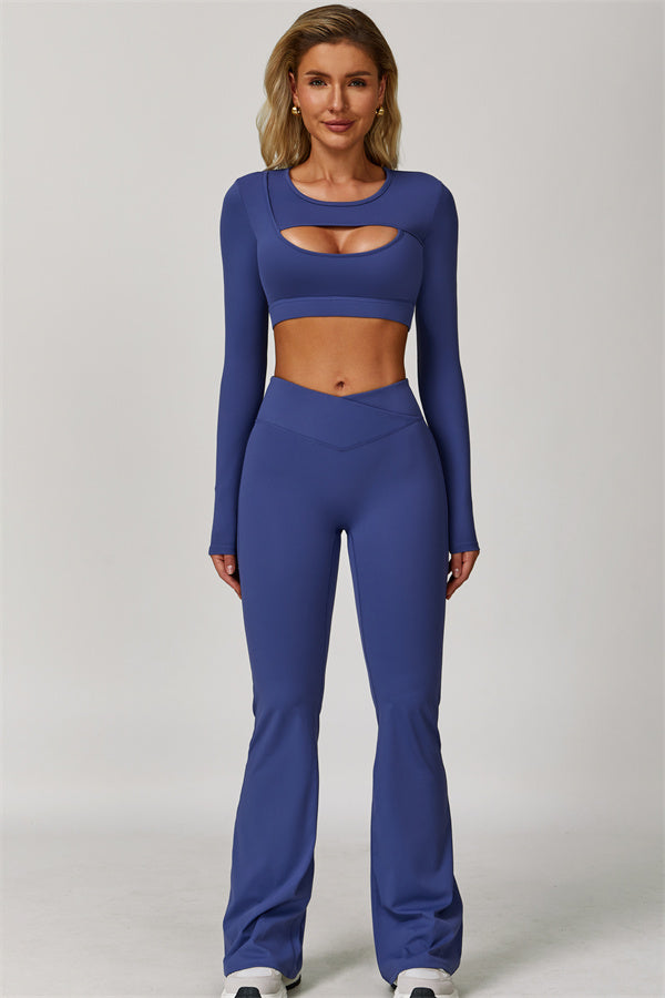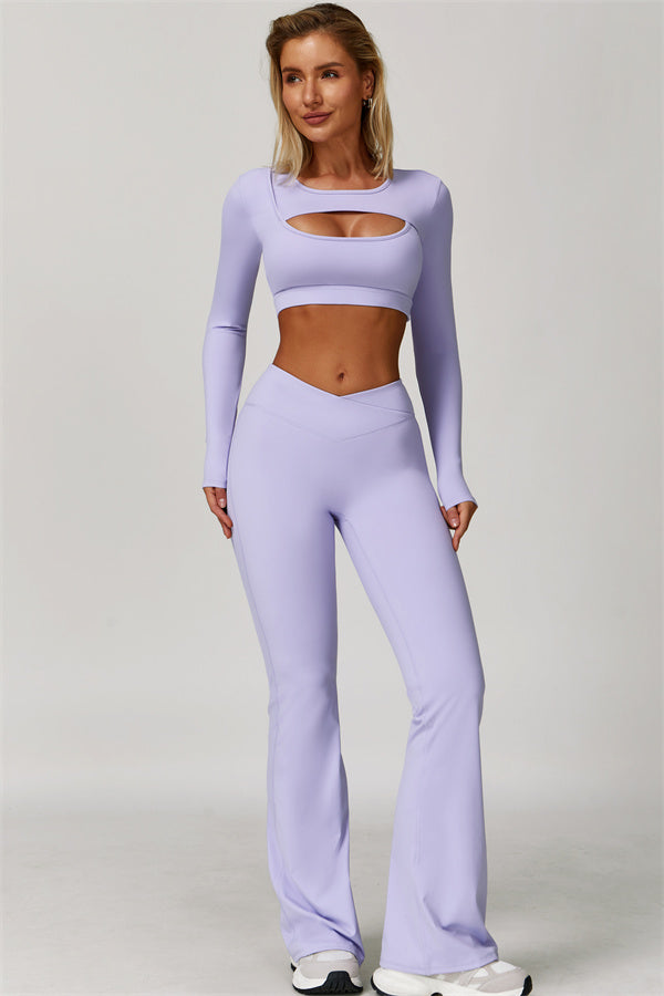 Designed to turn heads and move with you, this two-piece set combines sleek performance features with elegant, fashion-forward design. It includes a cut-out long sleeve crop top and sculpting flared leggings, perfect for both active days and laid-back plans.
