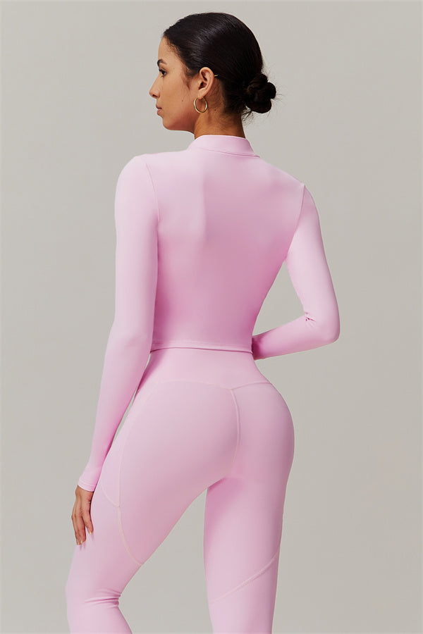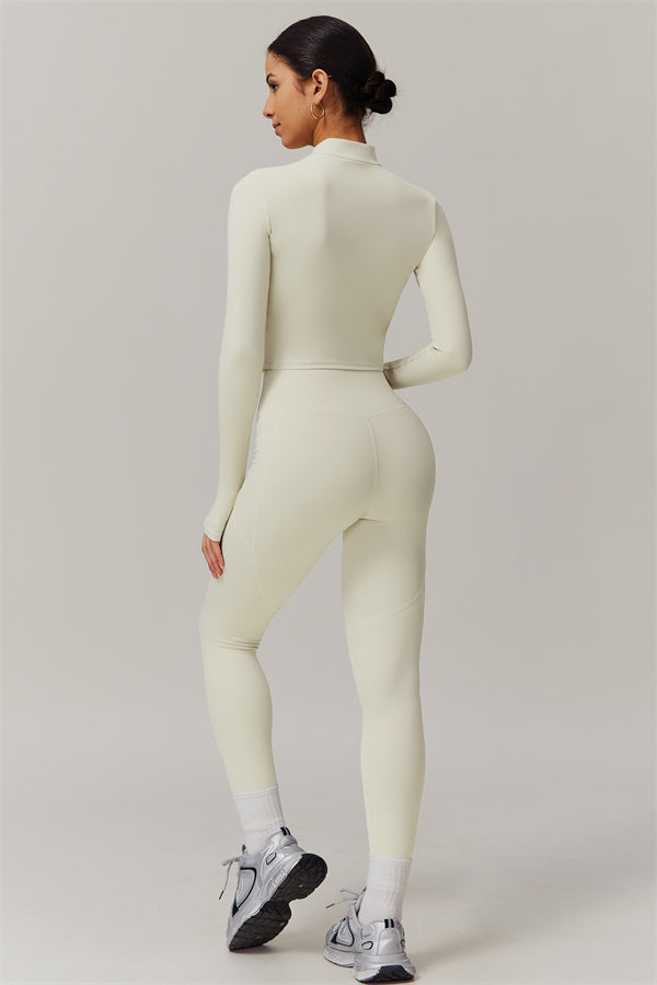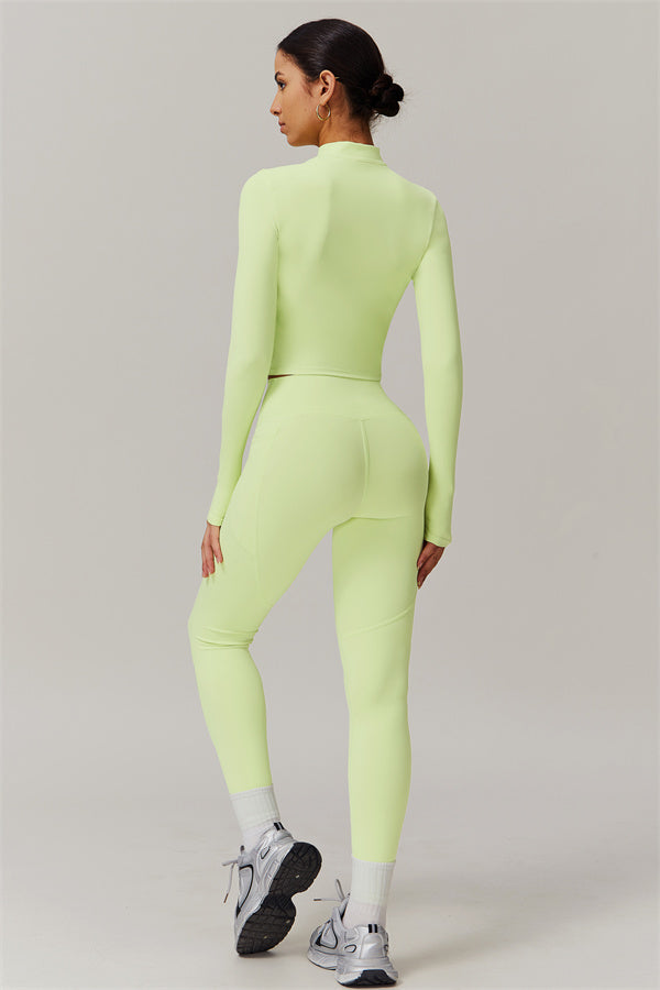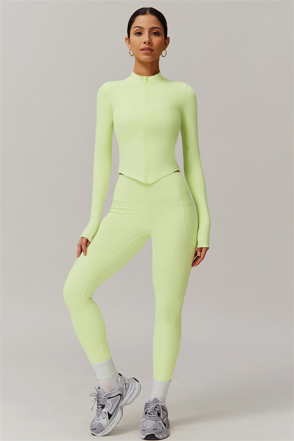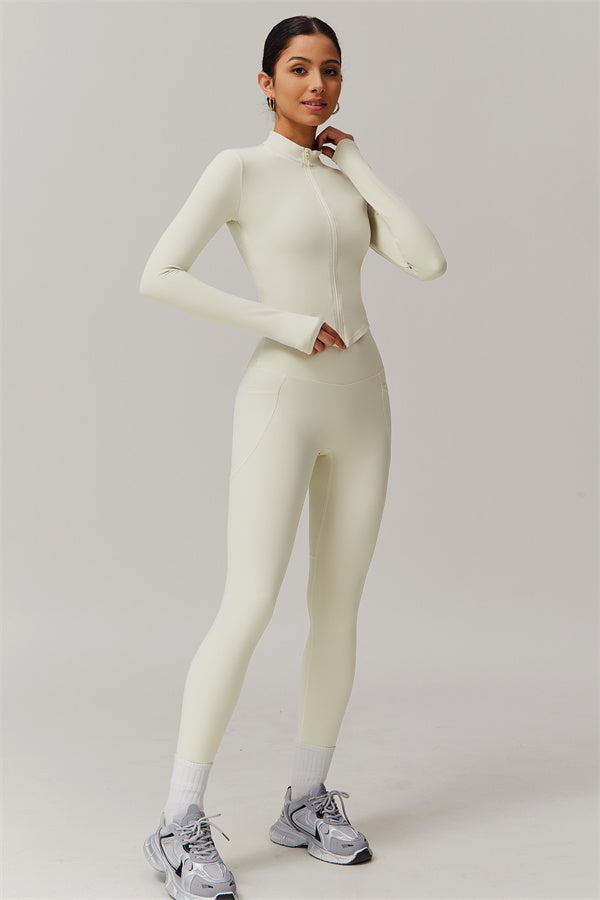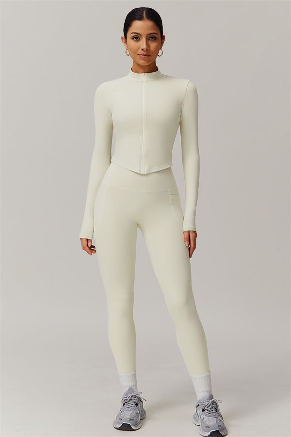 Elevate your activewear game with this sophisticated matching set, featuring a sleek jacket and figure-hugging leggings. The jacket is designed with a stand collar and full-zip closure for adjustable coverage and wind protection, adding a sporty edge to your look. Long cuffs provide slip-resistant comfort, while the V-shaped hemline contours to your body, enhancing your silhouette. Functional side pockets offer convenient storage for your essentials.