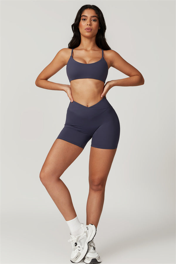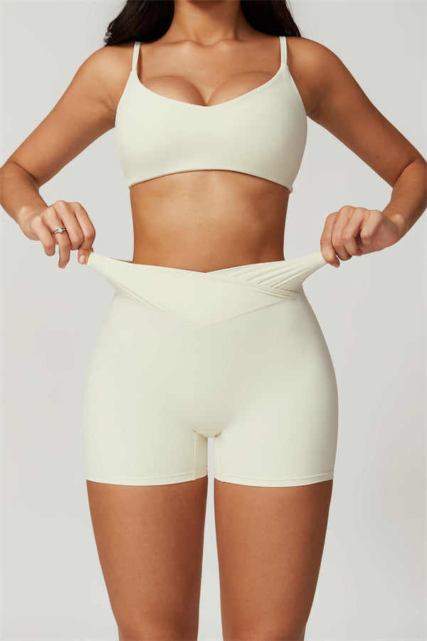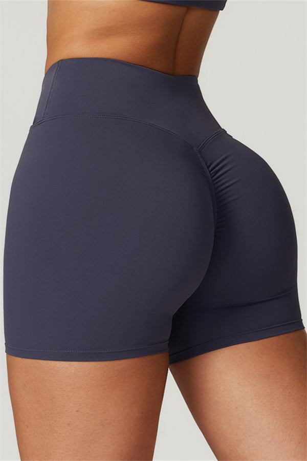 Elevate your workout wardrobe with these high-waisted shorts designed for both style and performance. The V-shaped cross-fold waistband provides a secure fit, ensuring the shorts stay in place no matter how intense your activity. The sculpting design enhances your natural curves, giving your glutes a lifted and rounded appearance.