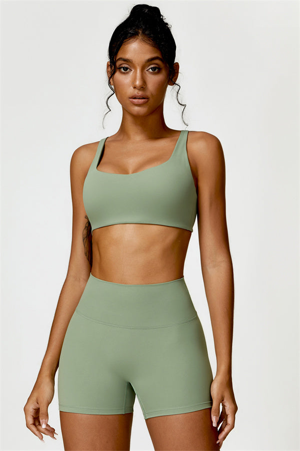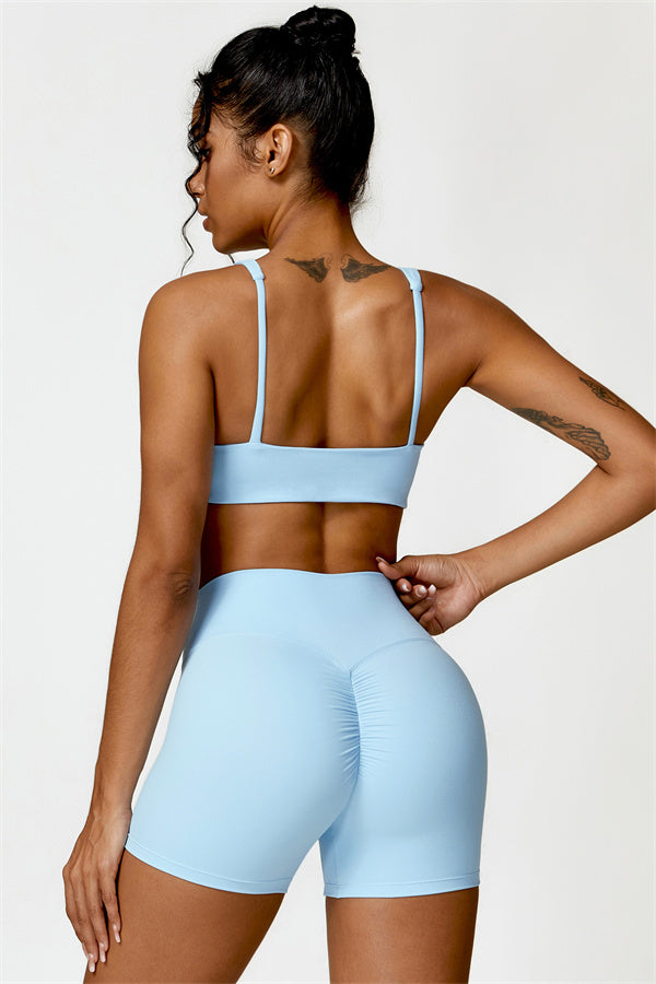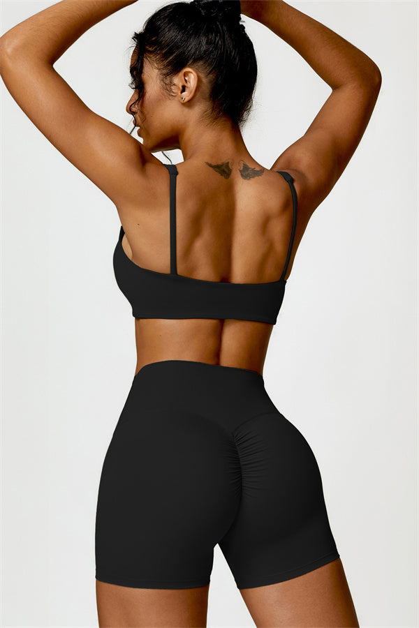 This matching set, featuring a sports bra and shorts, is designed for both comfort and performance. The sports bra is equipped with an elastic band at the bottom, offering effective support for your chest while ensuring a secure fit. The high-waisted shorts are designed with a curved waistband that elongates the legs, creating a flattering silhouette that enhances your figure.
