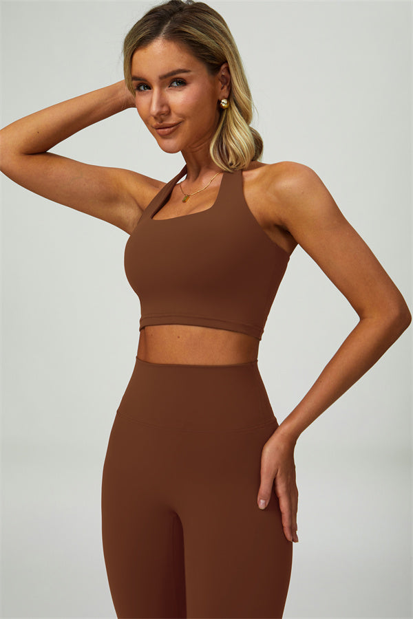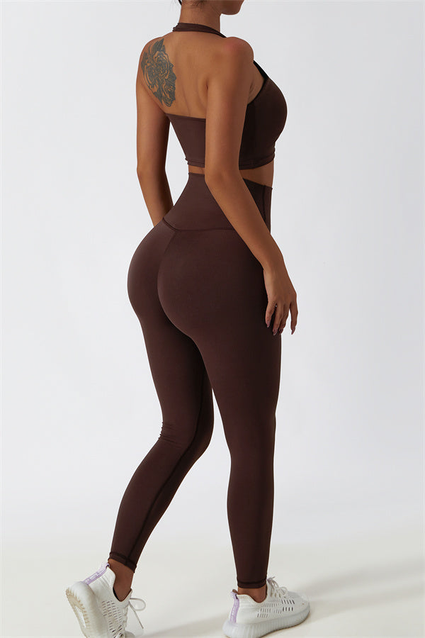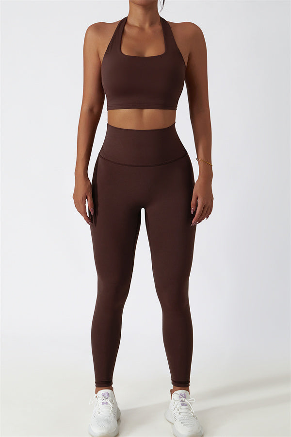 This matching set, featuring a sports bra and leggings, combines sleek design with performance-driven features. The sports bra showcases a chic hollow-back design, drawing attention to your back and adding a stylish twist. The high-waisted leggings are crafted to enhance your natural curves, accentuating your peach-shaped bottom for a flattering silhouette.