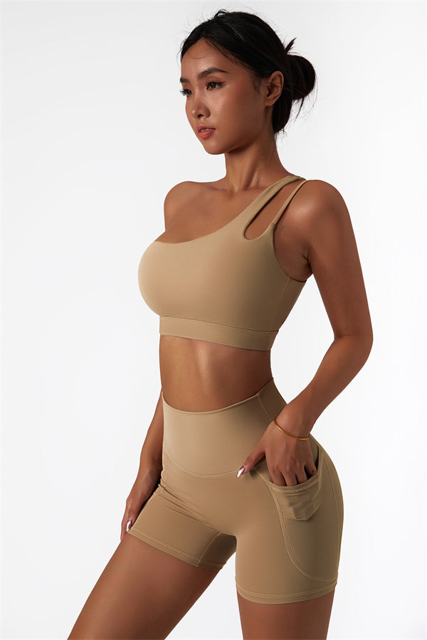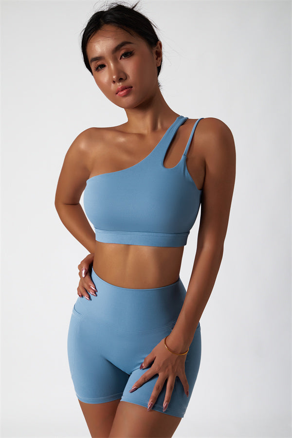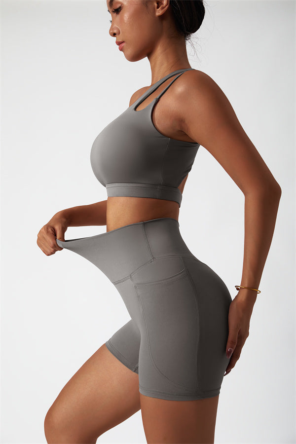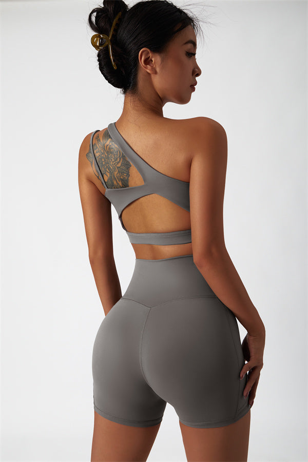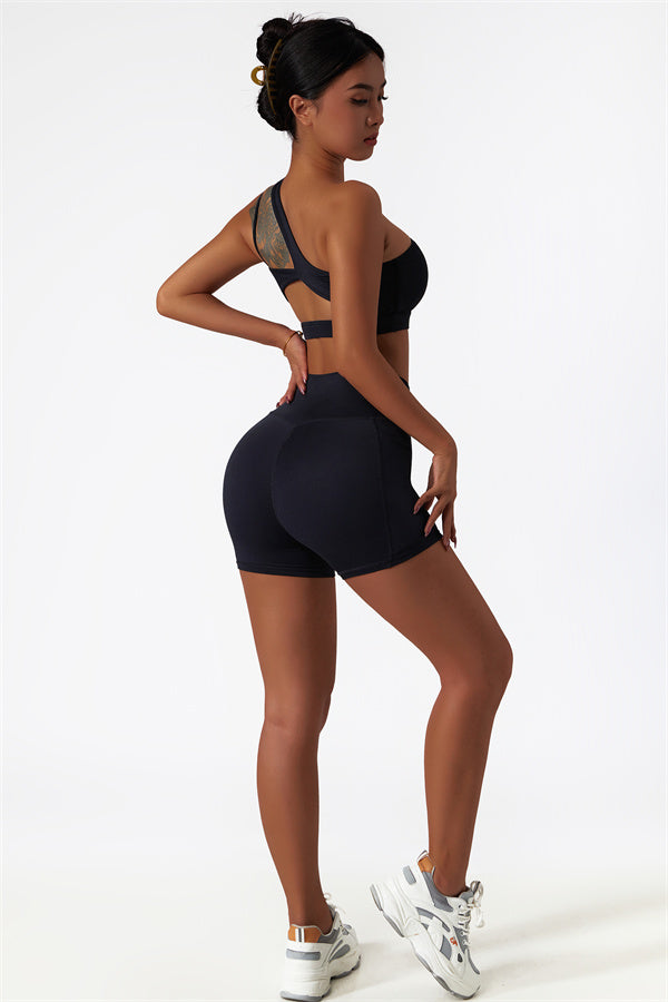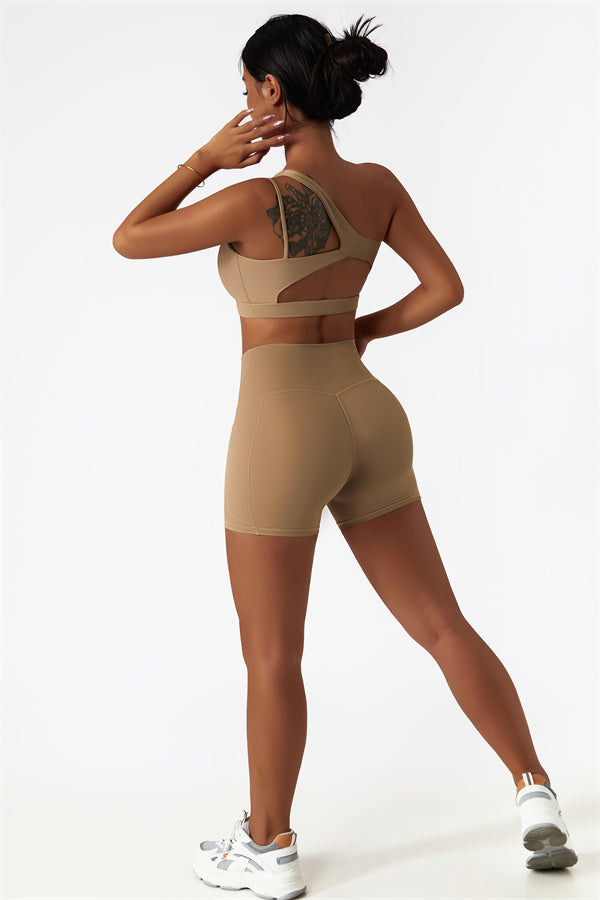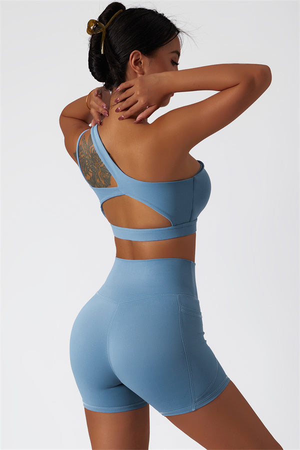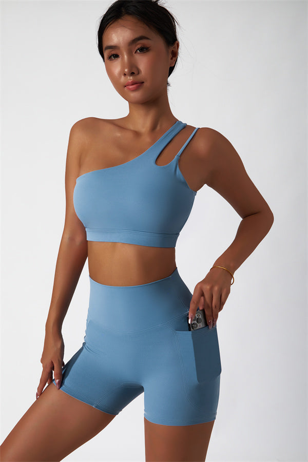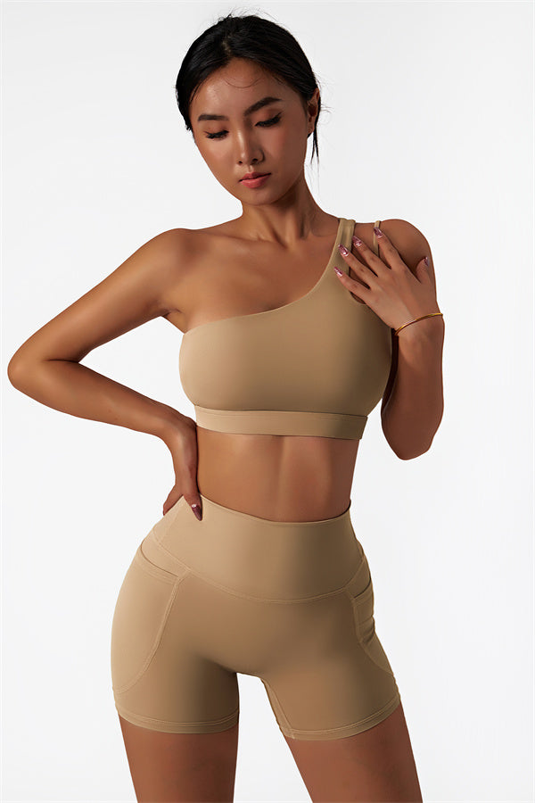 Elevate your activewear collection with this stylish and functional matching set, featuring a sports bra and shorts. The sports bra showcases a unique asymmetrical one-shoulder design, adding a touch of modern flair while providing comfortable support. The shorts are designed with side pockets, highlighting your curves and creating a flattering, peachy look.