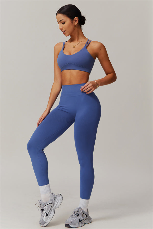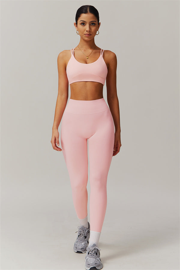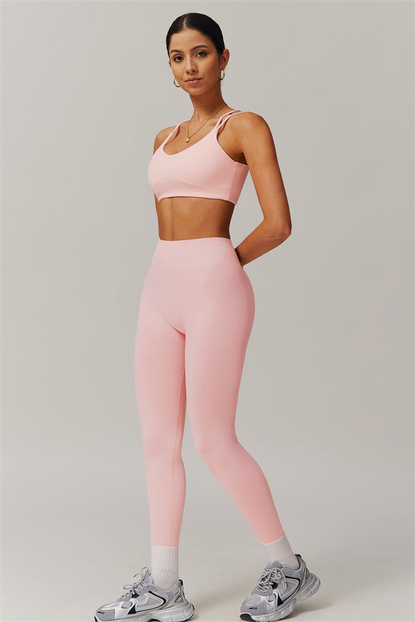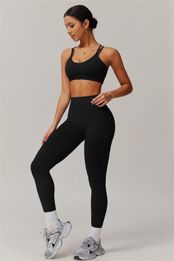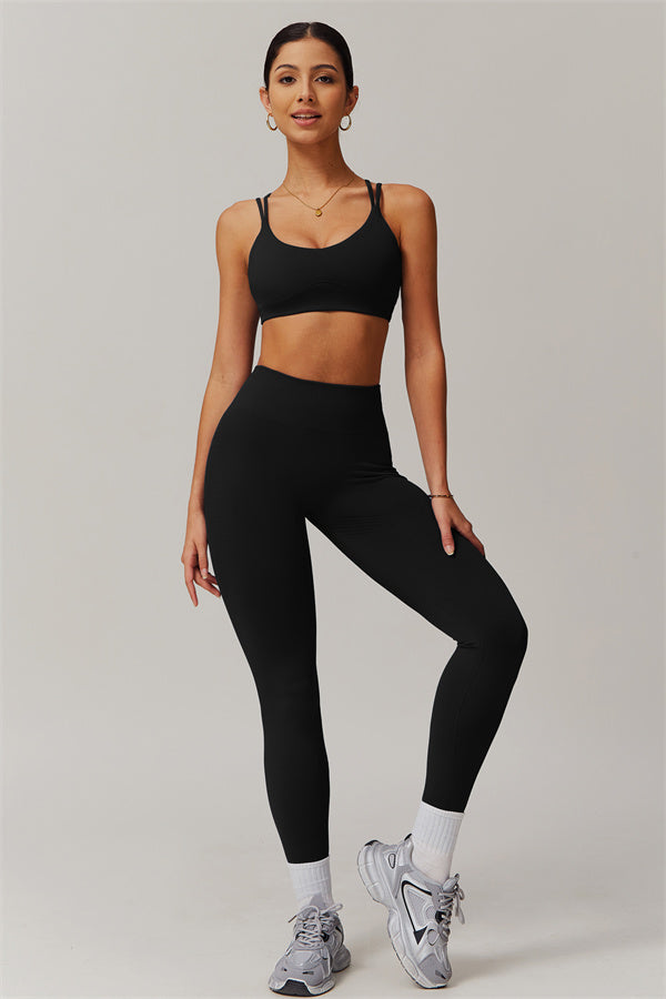 Elevate your activewear collection with this chic and functional matching set, designed to accentuate your natural curves while providing all-day comfort. The sports bra features an intricate multi-strap back design that highlights the beauty of your backline, while the front panel's sculpting seams enhance your bust with a rounded, supported look. The removable padding allows for a customized fit, perfect for both workouts and casual wear.