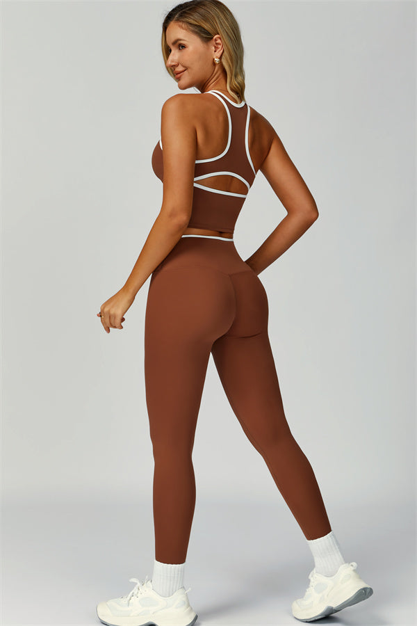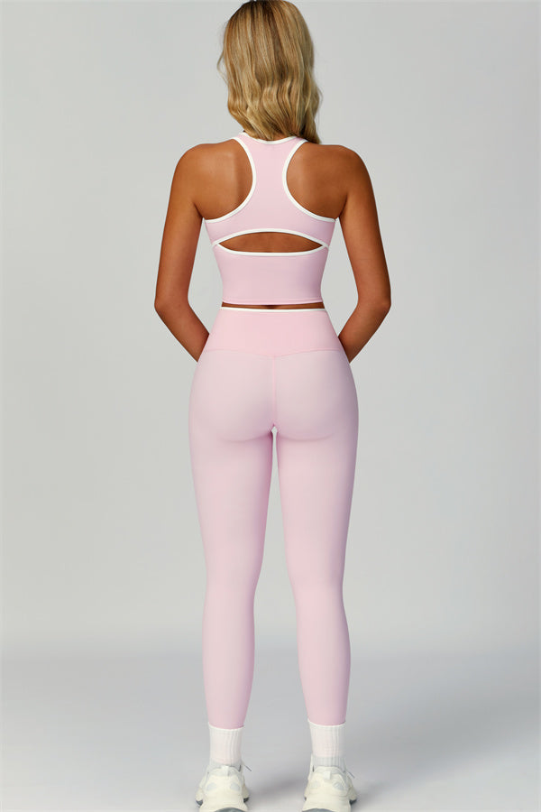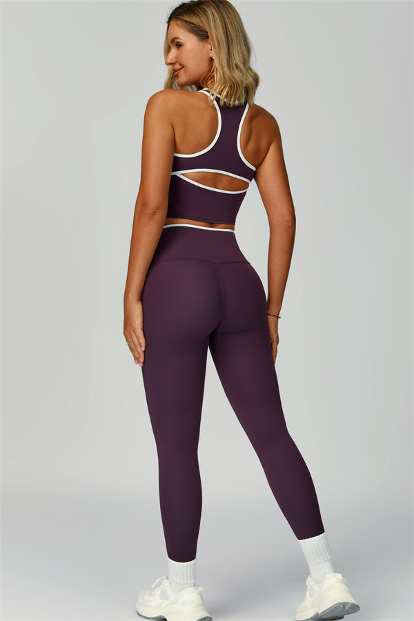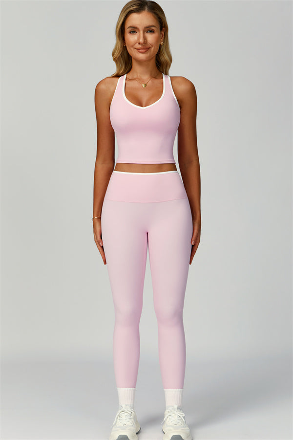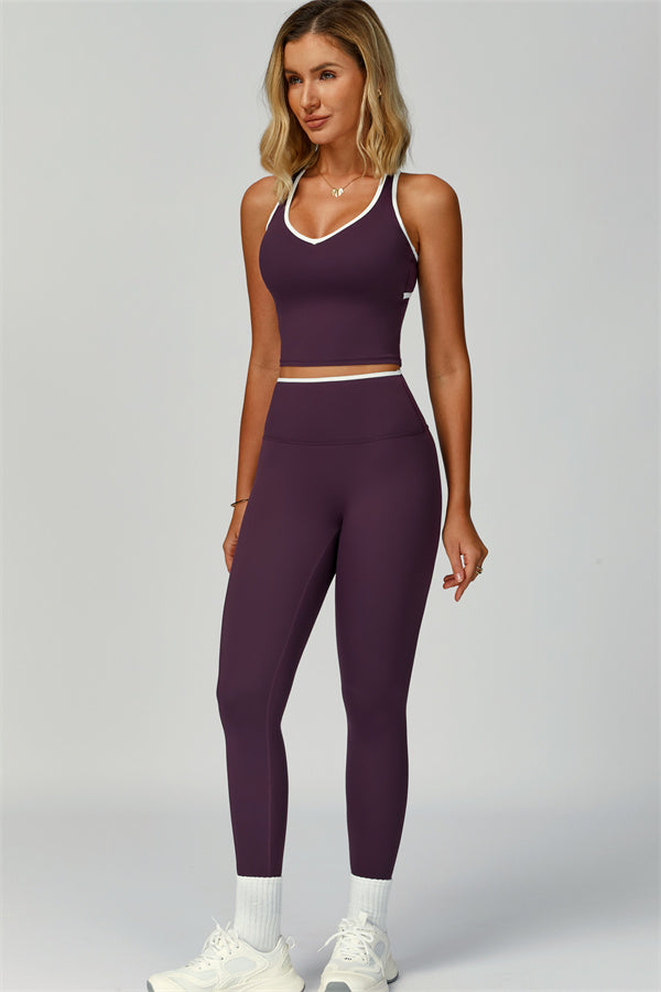 Power your workouts with The Quest Set, a sleek matching outfit that combines sculpting design with breathable comfort. Featuring a flattering V-neck tank and high-waisted leggings with bold contrast details.