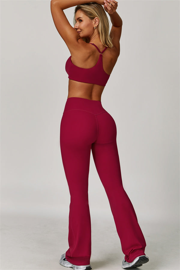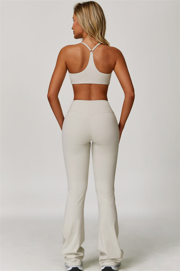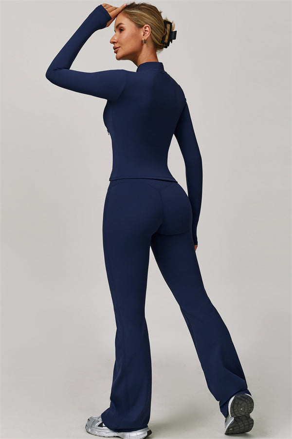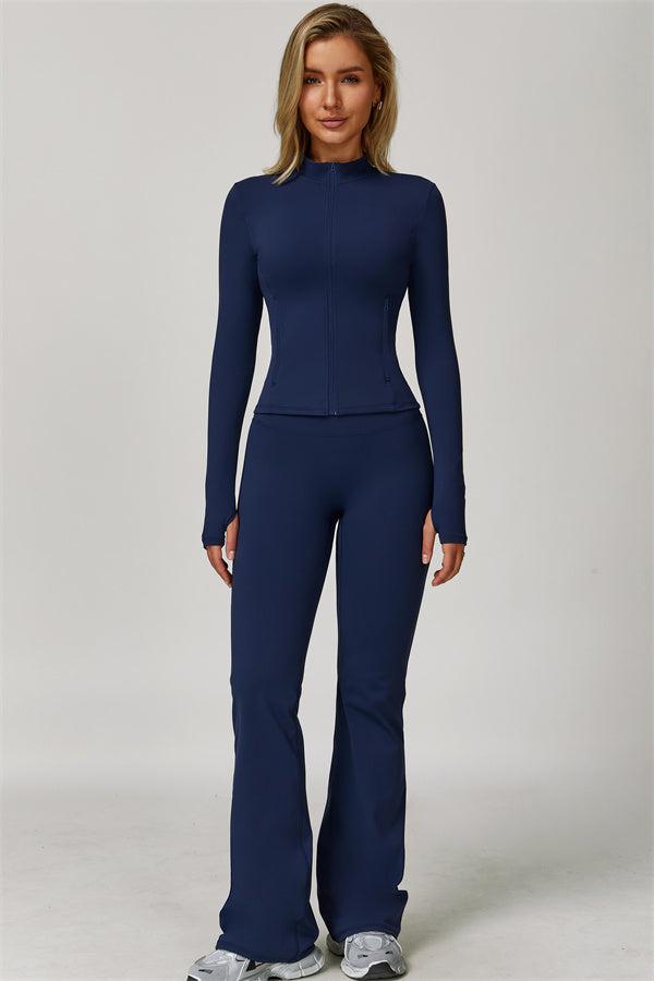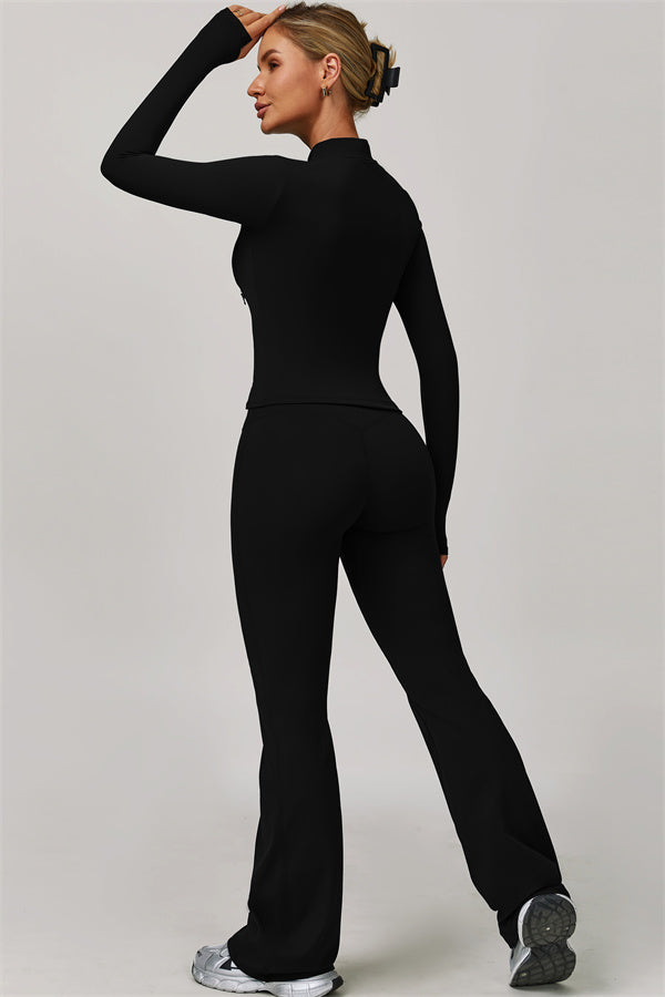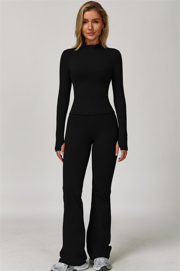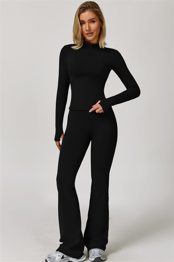 The Refresh Jacket Sports Bra Flared Leggings Set offers a balanced combination of functionality and style to keep you confident and comfortable all day.