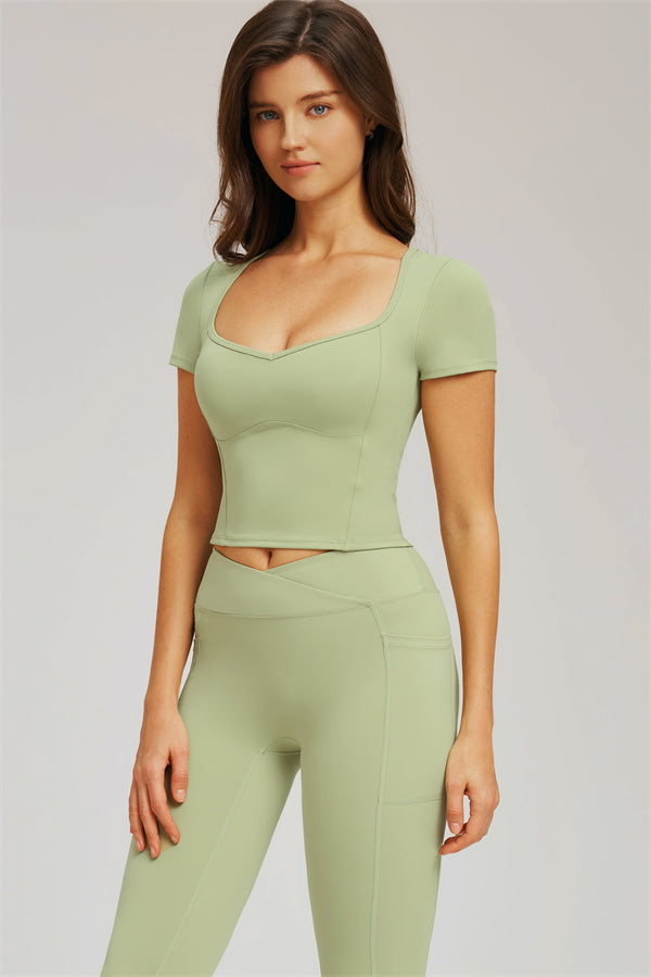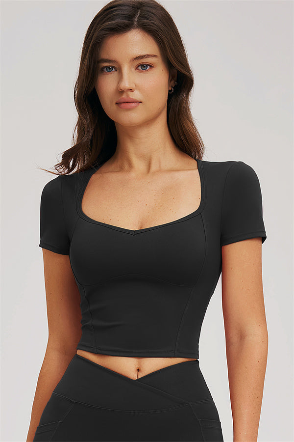 Diamond-shaped neckline highlights collarbone lines for a chic silhouette