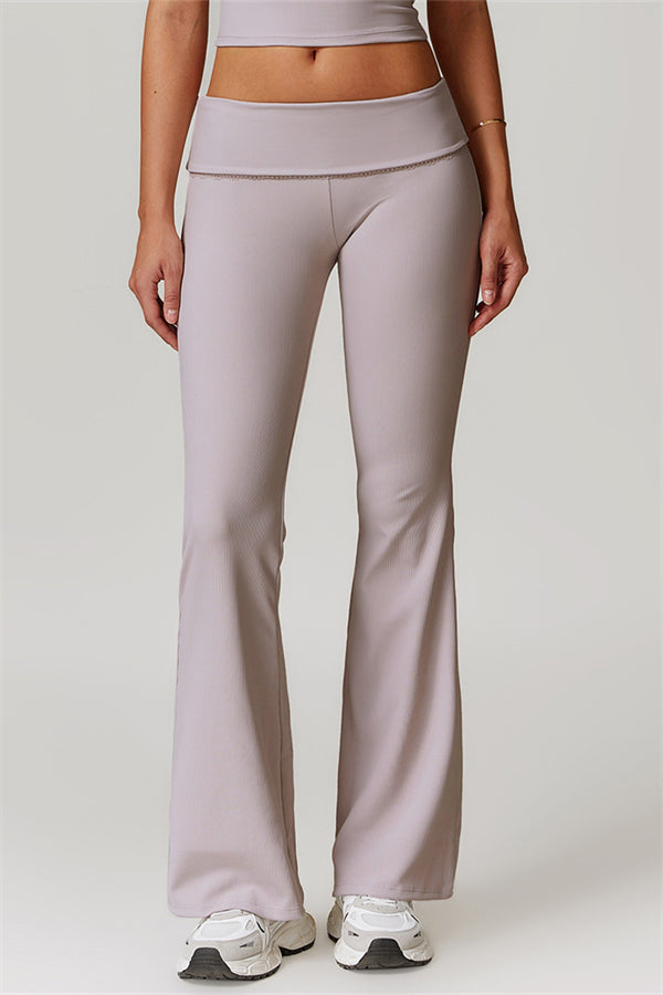 Designed with a ruching fold-over waistband that effortlessly smooths your midsection for a sleek look. The flared pant style beautifully conceals your calves while enhancing your thighs, creating a balanced silhouette. Featuring three-dimensional stitching on the front, these leggings add depth and texture to your outfit.